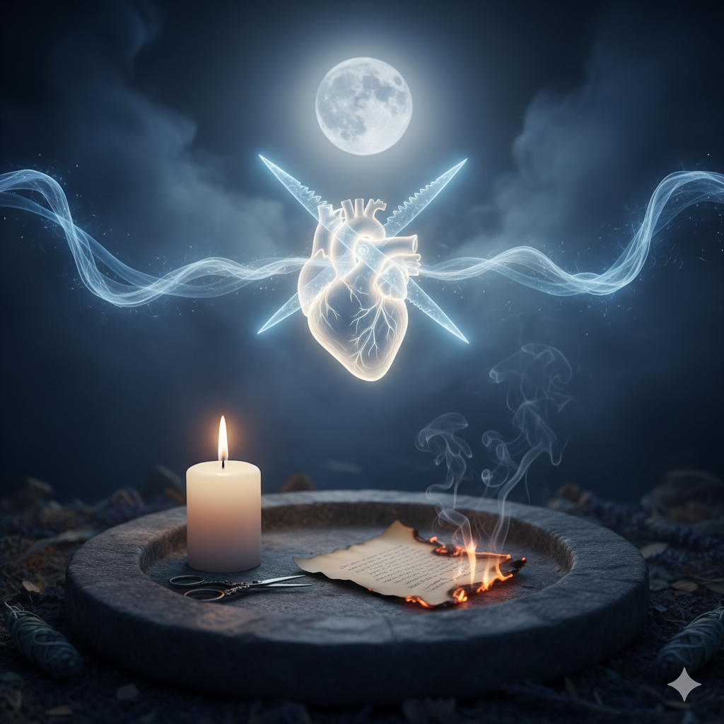 Imagine a night scene where the moonbeam gently illuminates the center. The image shows two bright, translucent, but delicately intertwined energetic threads (as if they were threads of light) that are heading towards a stylized human heart, but have not yet reached it. A translucent, slightly vibrating, sharp-bladed ethereal scissors or saber floats at the intersection of the threads, just about to cut the bonds. In the background is a hazy, gray, dissipating fog, which symbolizes old memories and burdens, and from which the bright threads are freed. The general mood of the image is one of relief, a clean beginning and liberation.